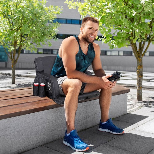 Convenient Design:  This portable stadium chair features 2 pocket storage pouch, an elastic arm pouch, and a rear-zippered storage compartment,perfect for keeping your water bottle or small belongings like keys and wallets within reach.